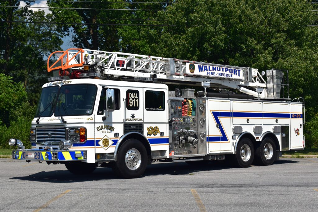 This vehicle was custom built for Diamond Fire Company in 2002. The chassis was built in Cleveland, North Carolina and the body/ladder was built in Ephrata, Pennsylvania. The ladder truck has seating for 6 firefighters and is powered by a Detroit Diesel with an Allison Automatic Transmission. It is equipped with a 75′ ladder, a 2000 GPM pump and 500 gallons of water. This vehicle is first out to all dwelling and structure fires.